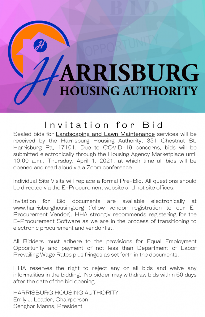 Sealed bids for Landscaping and Lawn Maintenance services will be received by the Harrisburg Housing Authority, 351 Chestnut St. Harrisburg Pa, 17101. Due to COVID-19 concerns, bids will be submitted electronically through the Housing Agency Marketplace until 10:00 a.m., Thursday, April 1, 2021, at which time all bids will be opened and read aloud via a Zoom conference.