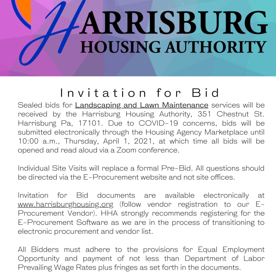 Invitation for Bid Sealed bids for Landscaping and Lawn Maintenance services will be received by the Harrisburg Housing Authority, 351 Chestnut St. Harrisburg Pa, 17101. Due to COVID-19 concerns, bids will be submitted electronically through the Housing Agency Marketplace until 10:00 a.m., Thursday, April 1, 2021, […]