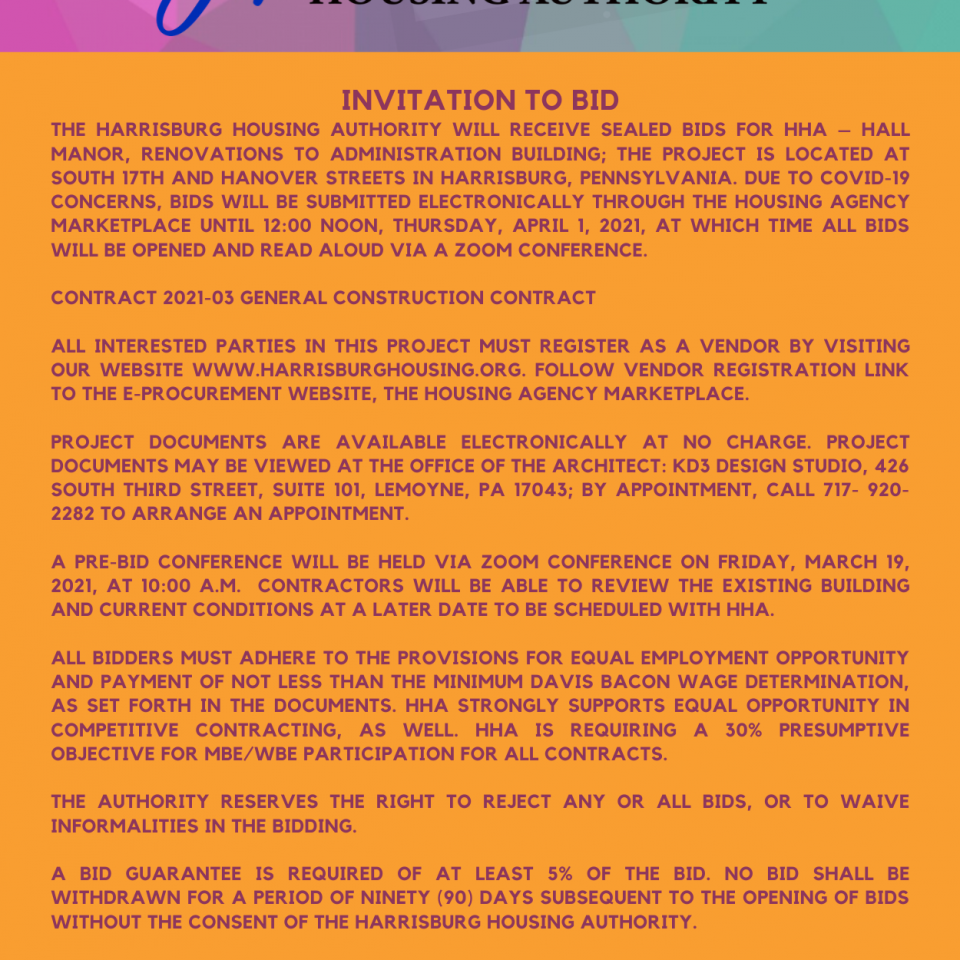INVITATION TO BIDThe Harrisburg Housing Authority will receive sealed bids for HHA – Hall Manor, Renovations to Administration Building; the project is located at South 17th and Hanover Streets in Harrisburg, Pennsylvania. Due to COVID-19 concerns, bids will be submitted electronically through the Housing Agency Marketplace […]
