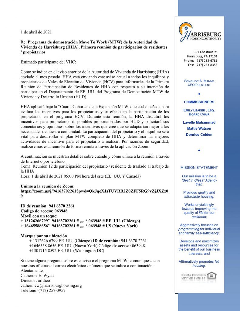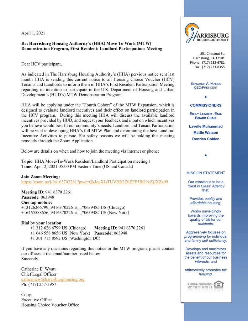 HHA is working to become a Move To work agency. Please see below how to learn more about upcoming information sessions. Log on to Zoom to join: https://tinyurl.com/HHAMTW April 12, 2021 at 5:00 PM.